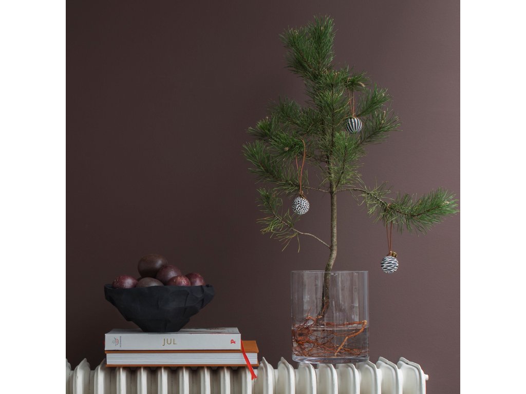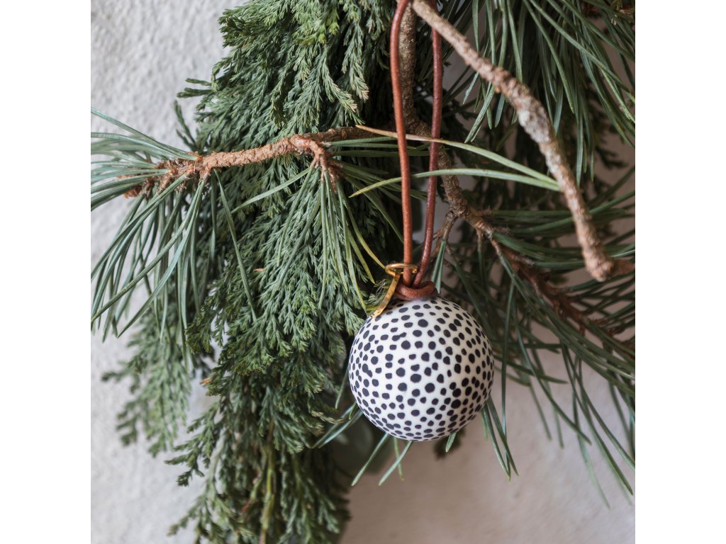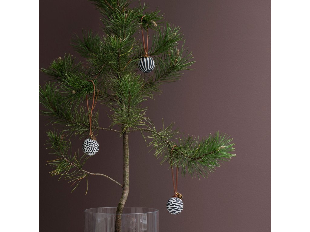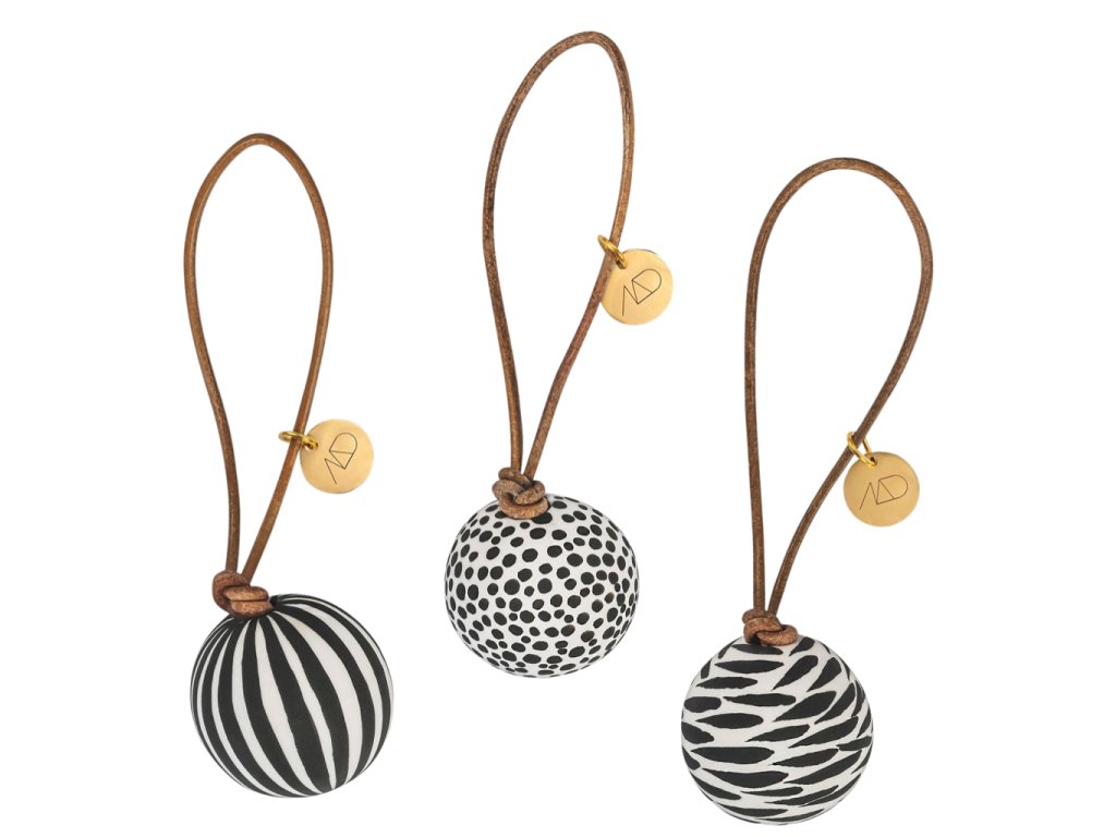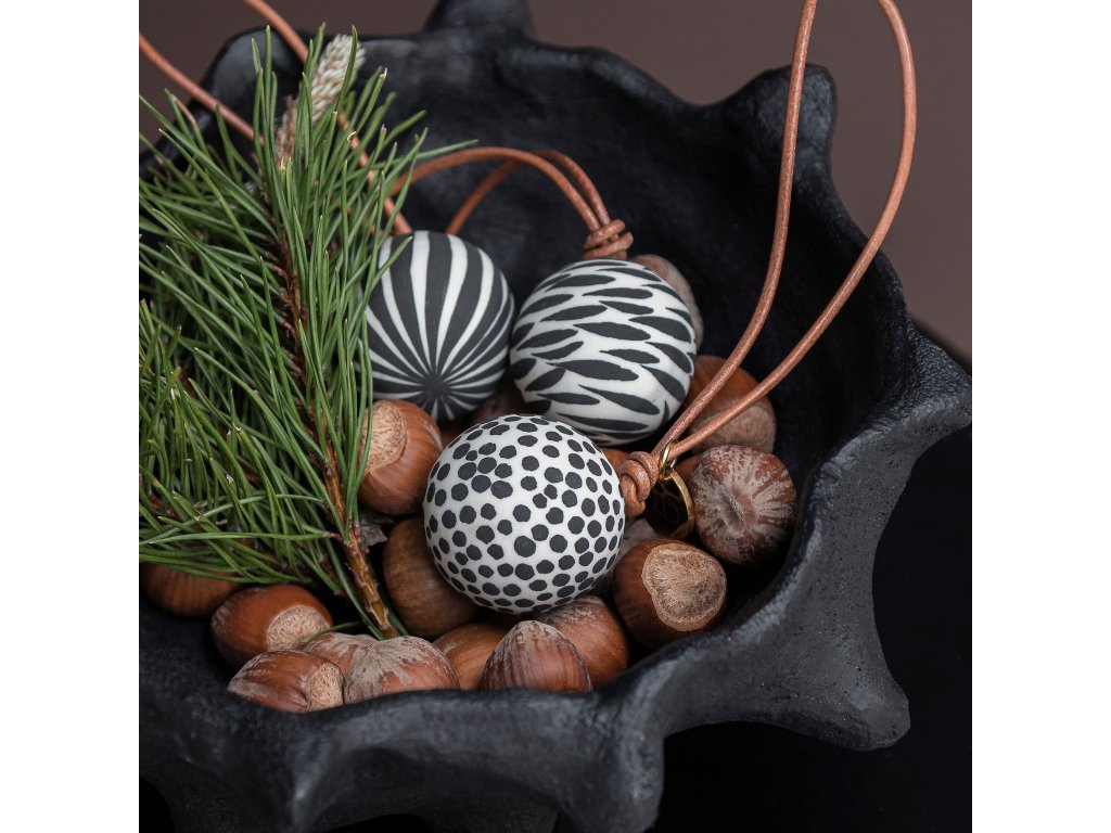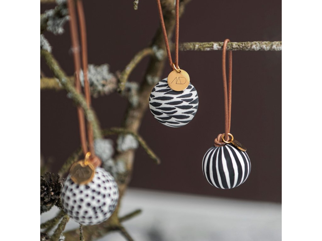 Porcelánové ozdoby Globe od Mette Ditmer vnesou do vašeho vánočního zdobení hravost i eleganci v severském stylu. Sada obsahuje tři matné baňky o průměru 3,5 cm, z nichž každá je ručně malovaná originálním černobílým vzorem – proužky, puntíky a abstraktními tahy. Každá ozdoba je zavěšena na hnědé kožené šňůrce doplněné o drobný zlatý štítek s logem MD, což jí dodává jemný a sofistikovaný detail.