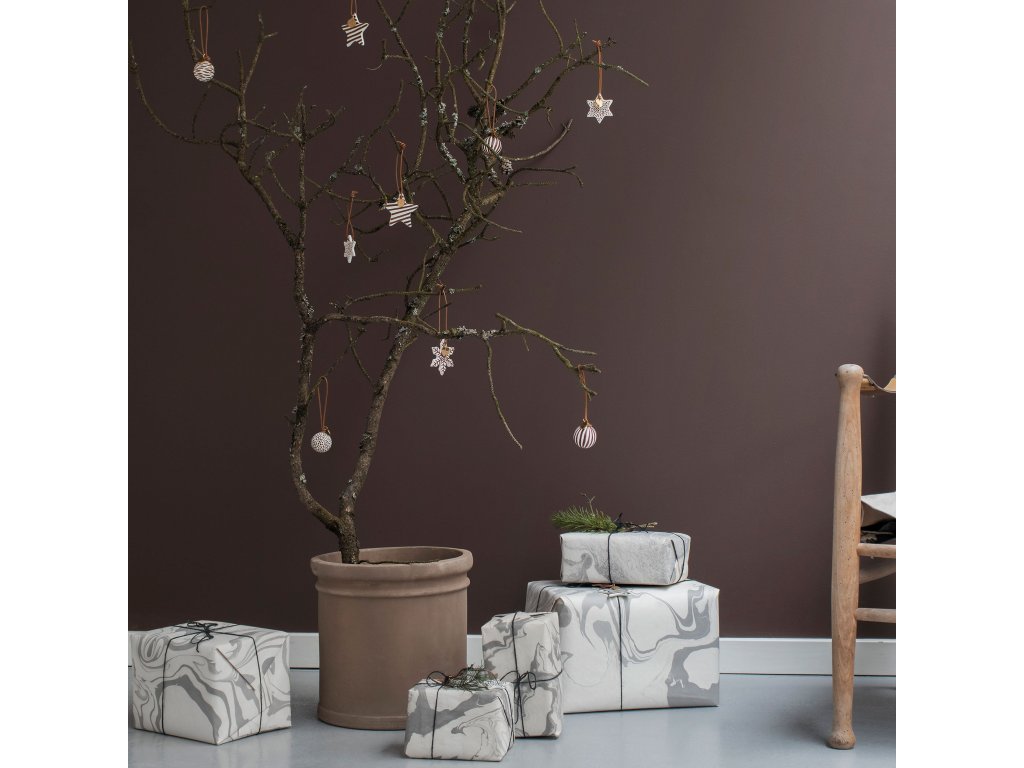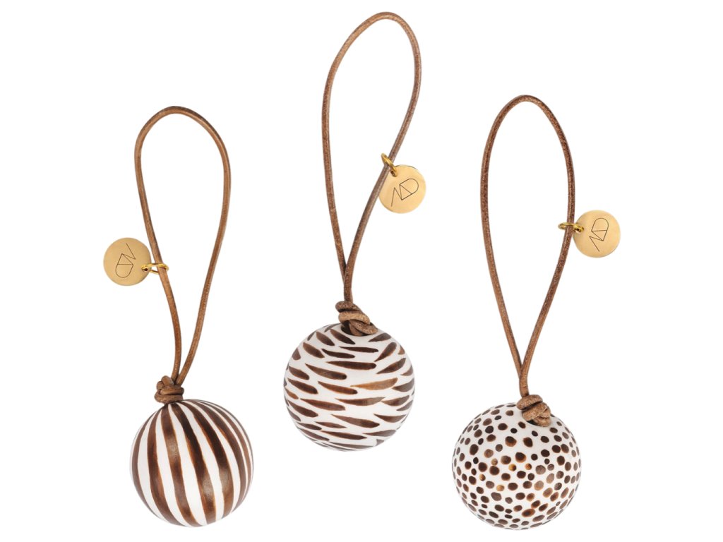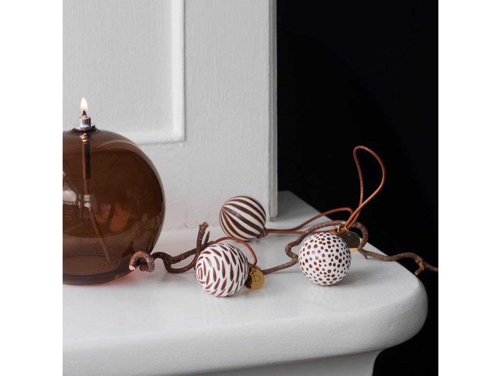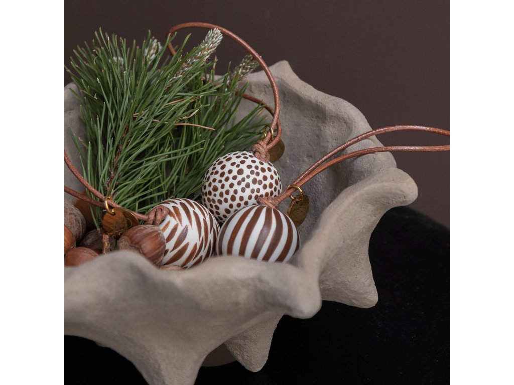 Porcelánové ozdoby Globe od Mette Ditmer vnesou do vašeho vánočního zdobení hravost i eleganci v severském stylu. Sada obsahuje tři matné baňky o průměru 3,5 cm, z nichž každá je ručně malovaná originálním hnědobílým vzorem – proužky, puntíky a abstraktními tahy. Každá ozdoba je zavěšena na hnědé kožené šňůrce doplněné o drobný zlatý štítek s logem MD, což jí dodává jemný a sofistikovaný detail.