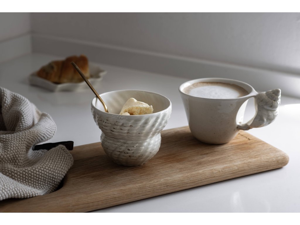 Každý šálek je ručně vyráběn v Dánsku a nese v sobě stopy pečlivého řemeslného zpracování. Díky tomu je každý kus jedinečný a může se lišit v drobných detailech, které mu dodávají na autenticitě. Skvěle se kombinuje s dezertním talířkem z kolekce Konkylie, se kterým tvoří harmonický pár pro pomalé stolování. Krásně vynikne na prostřeném stole i jako osobitý detail v domácí vitríně.