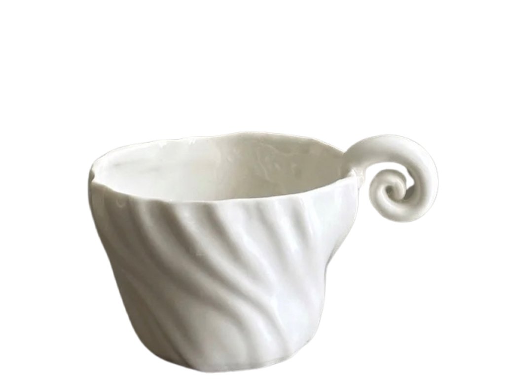 Porcelánový hrnek s ouškem Spira je ručně vyrobený kousek inspirovaný rytmem moře a krásou písčitého dna, které odhalí své linie po opadnutí vody. Organický tvar, jemná vlna na povrchu a zatočené ouško připomínající spirálu evokují pomíjivost i klid pobřeží, a přesně tak působí i chvíle, které si s tímto hrnkem dopřejete.