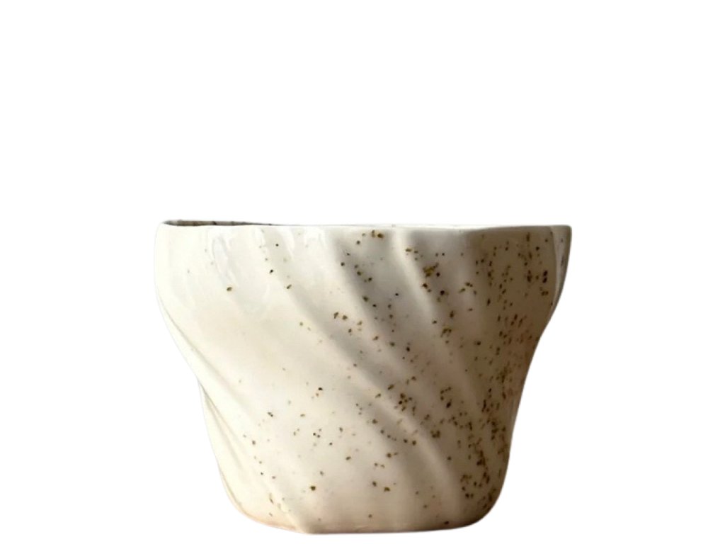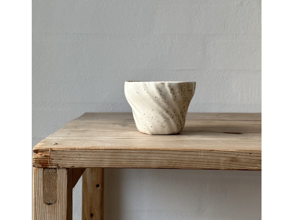 Ručně vyrobený porcelánový šálek inspirovaný rytmem moře a krásou písčitého dna, které odhalí své linie po opadnutí vody. Organický tvar a jemná vlna na povrchu připomínají pomíjivost i klid pobřeží – a přesně tak působí i chvíle, které si s tímto šálkem dopřejete. Béžové kropení na povrchu připomíná zrnka písku a dodává šálku přirozenou hloubku i vizuální strukturu.