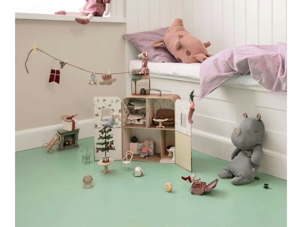 Po otevření se před vámi rozvine ilustrovaný interiér, kde každý pokoj zdobí vintage tapety typické pro Maileg. V horním patře najdete útulnou ložnici s krásnou palandou se dvěma lůžky a praktickým úložným prostorem. Každá postýlka je vybavena měkkou peřinkou a polštářkem, aby se myšky mohly zachumlat a pohodlně usnout po dni plném her.