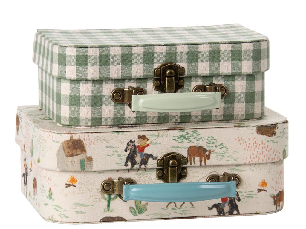 Design pro malé kovboje: Větší kufřík zdobí ilustrace z koňského ranče, zatímco menší sází na nadčasovou zelenou kostku. Společně tvoří dokonale sladěný pár, který ozdobí každou poličku.
