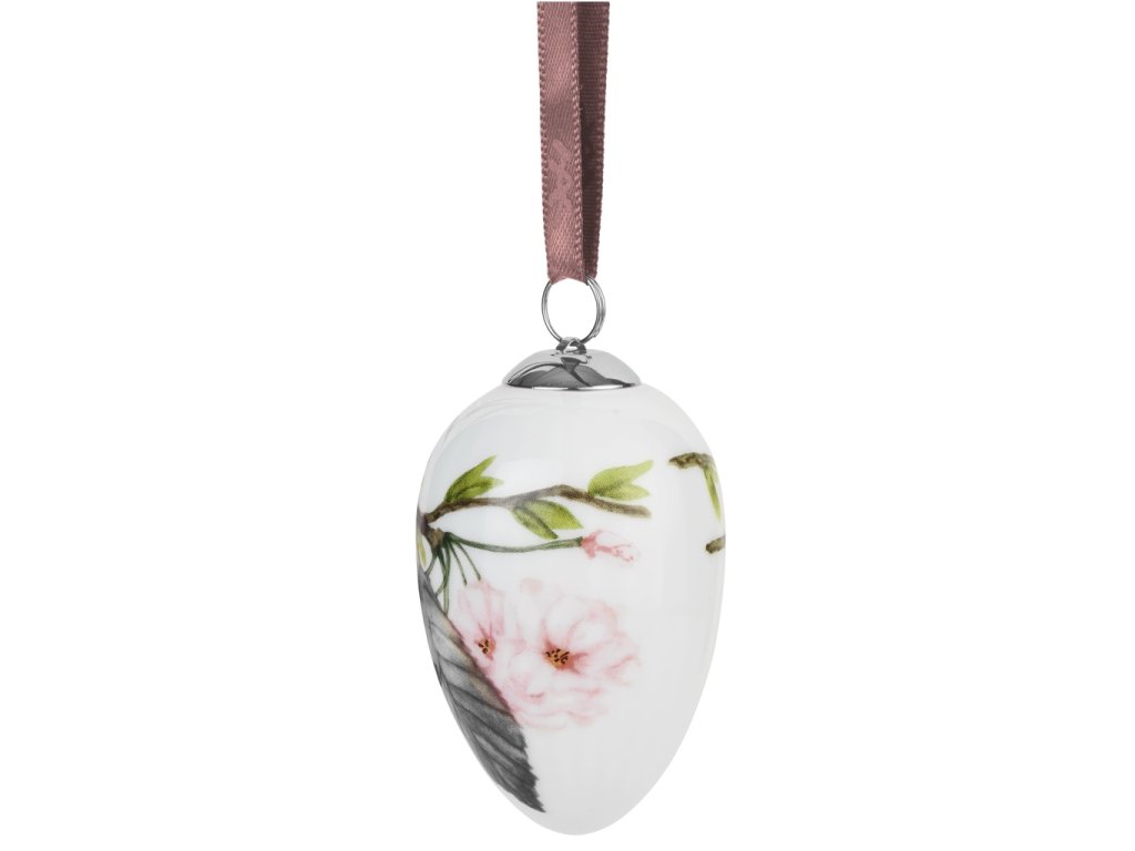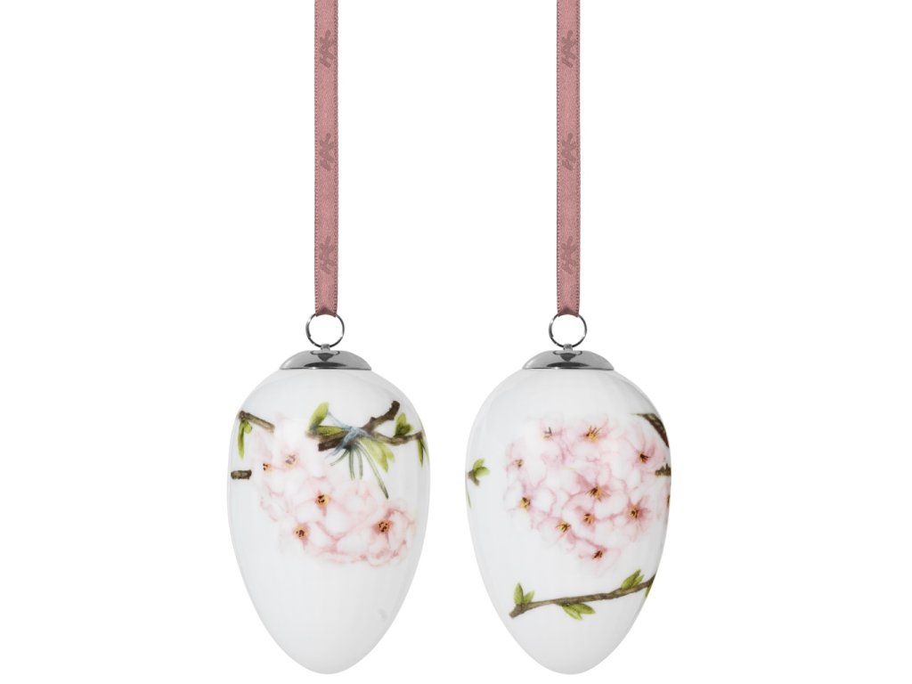 V této sadě najdete dvě porcelánová vajíčka, jež spojují tradiční symboliku jara s nadčasovým skandinávským výrazem. Každé vajíčko zdobí detailní ilustrace rozkvetlých větviček s něžnými růžovými květy a svěže zelenými lístky. Odstíny pudrově růžové, světlé zelené a tlumené hnědé krásně vynikají na bílém porcelánu. Vajíčko je doplněno stříbrným kovovým očkem a hedvábnou stužkou ve starorůžové barvě, která podtrhuje jejich elegantní charakter.
