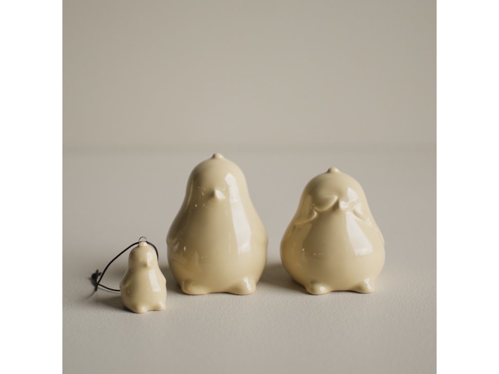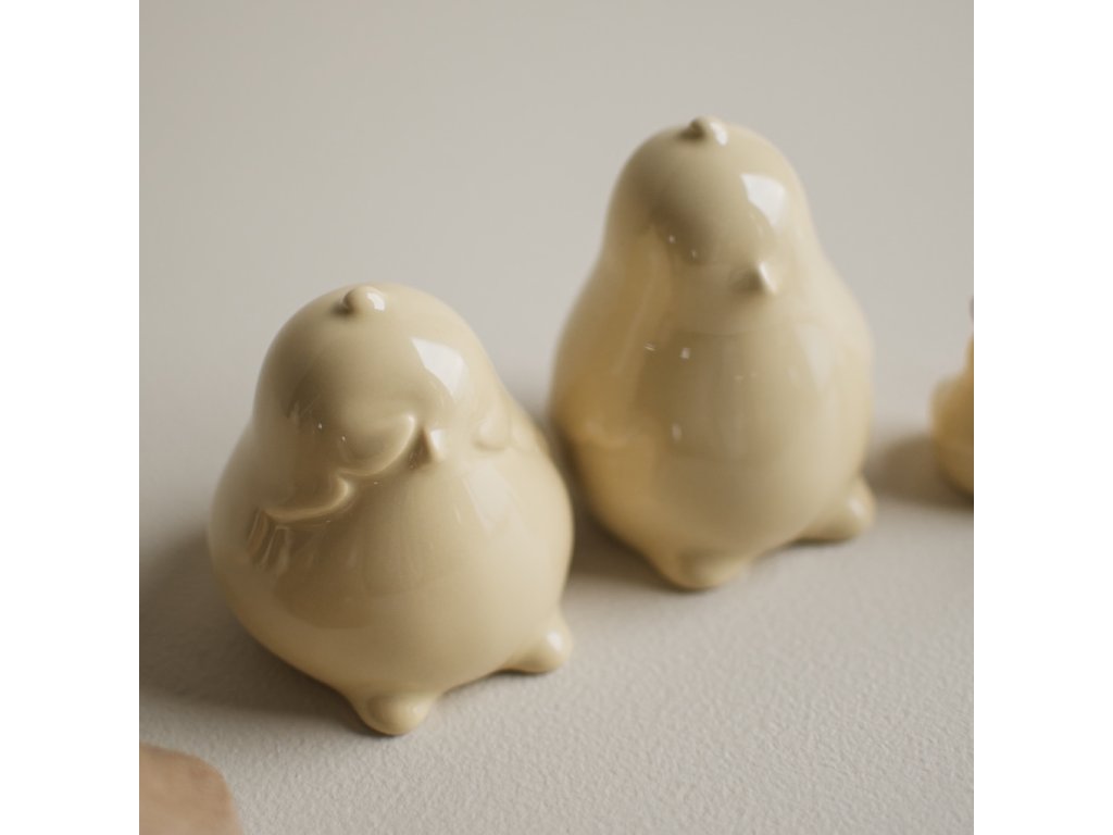 Kuřátka jsou vyrobena z keramiky s lesklou glazurou v pastelově žlutém odstínu. Každé kuřátko podtrhuje minimalistická silueta s decentně naznačenými křidélky a zobáčkem.
