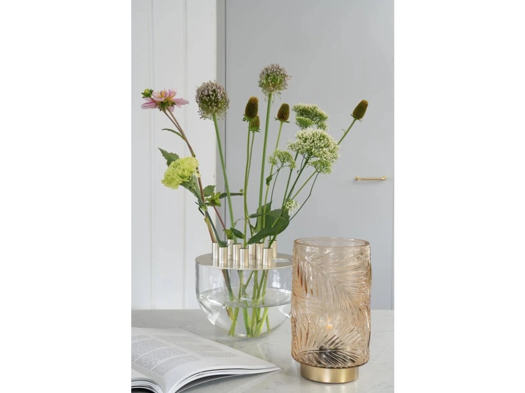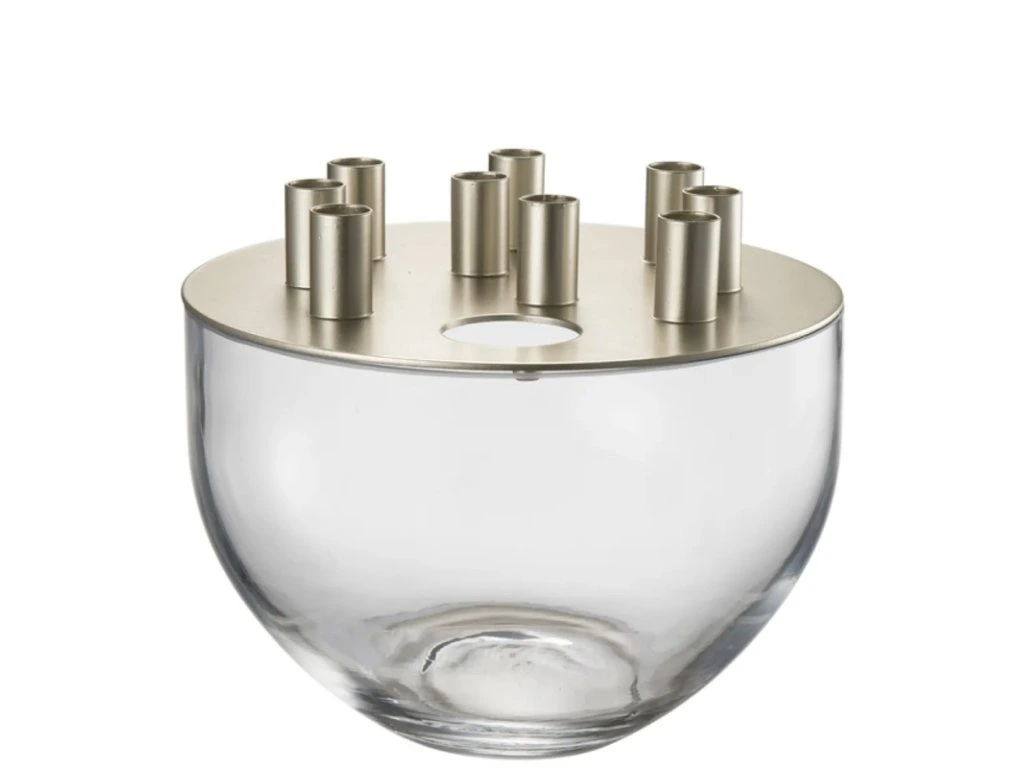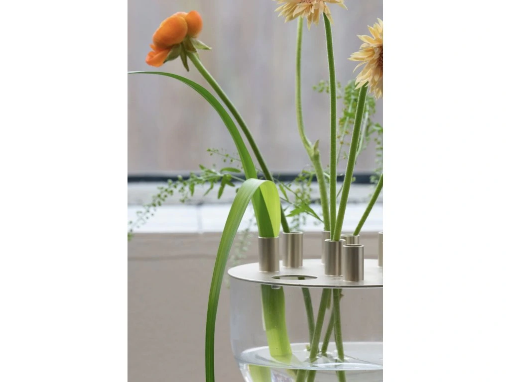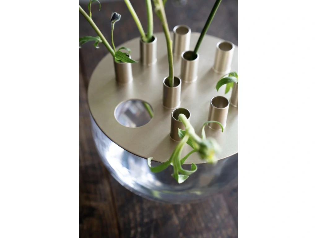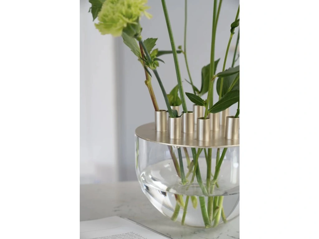 Váza Ashley má organický tvar, který je tvořen skleněnou mísou a kovovým víkem, které má praktický otvor pro snadné uchopení a 9 kalíšků pro umístění živých stonků květin do mísy s vodou. Celkové aranžmá květin je tak jednoduché a přesto efektivní. Umístěte vázu jako středový prvek na jídelní stůl, kde podtrhne atmosféru během všedních i slavnostních příležitostí.