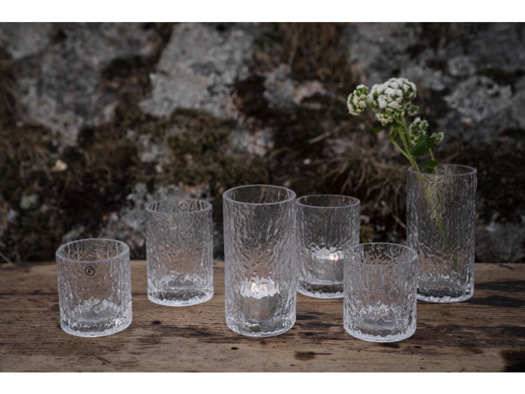 Kouzlo tohoto skla vynikne ještě více, pokud zkombinujete několik velikostí dohromady – světlo svíček se bude v jejich plastickém povrchu lámat a odrážet, díky čemuž vznikne atmosféra plná jemného třpytu a hloubky.