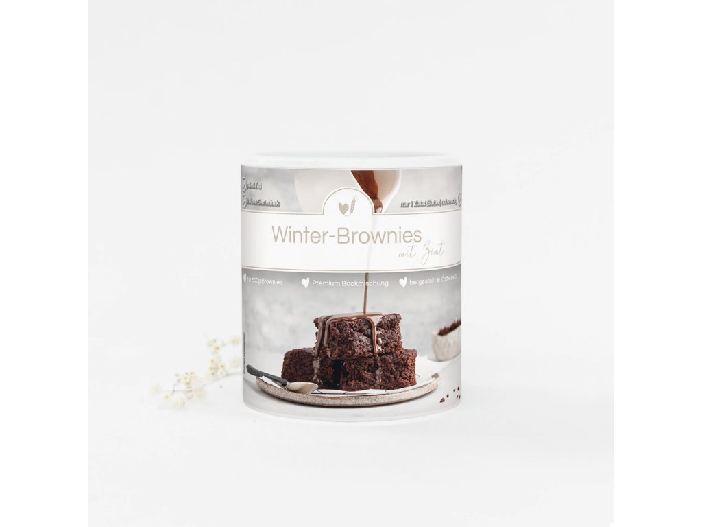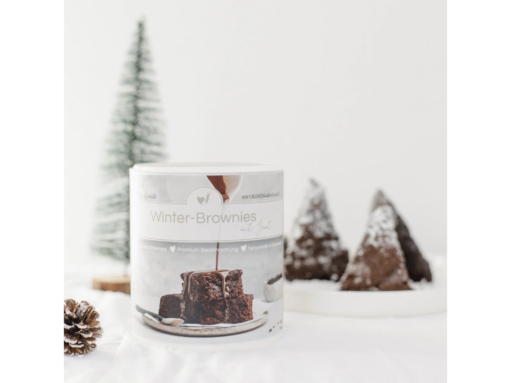 Předehřejte troubu na 180 °C (horní a dolní ohřev). Otevřete dózu a směs nasypte do mísy. Přidejte 60 g rozpuštěného másla a 100 ml vody, poté míchejte 1 minutu, dokud nevznikne hladké těsto. Těsto přeneste do formy (cca 18 × 18 cm) a pečte 25 minut. Po upečení nechte brownies vychladnout na mřížce, poté nakrájejte a můžete podávat. Pečicí směs vystačí na přibližně 500 g vláčných zimních brownies.