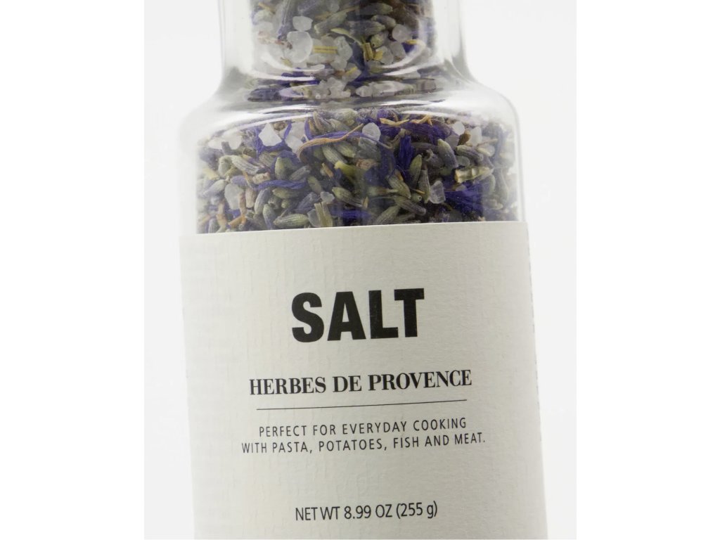 Složení: 94% mořská sůl, 2,8% provensálské byliny (rozmarýn, oregano, tymián, bazalka, majoránka, květy levandule, chrpa), může obsahovat stopy ořechů, arašídů, mléka, hořčice a siřičitanů