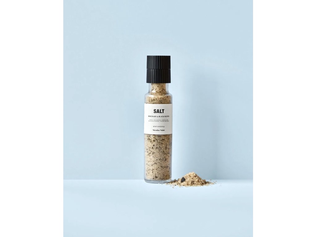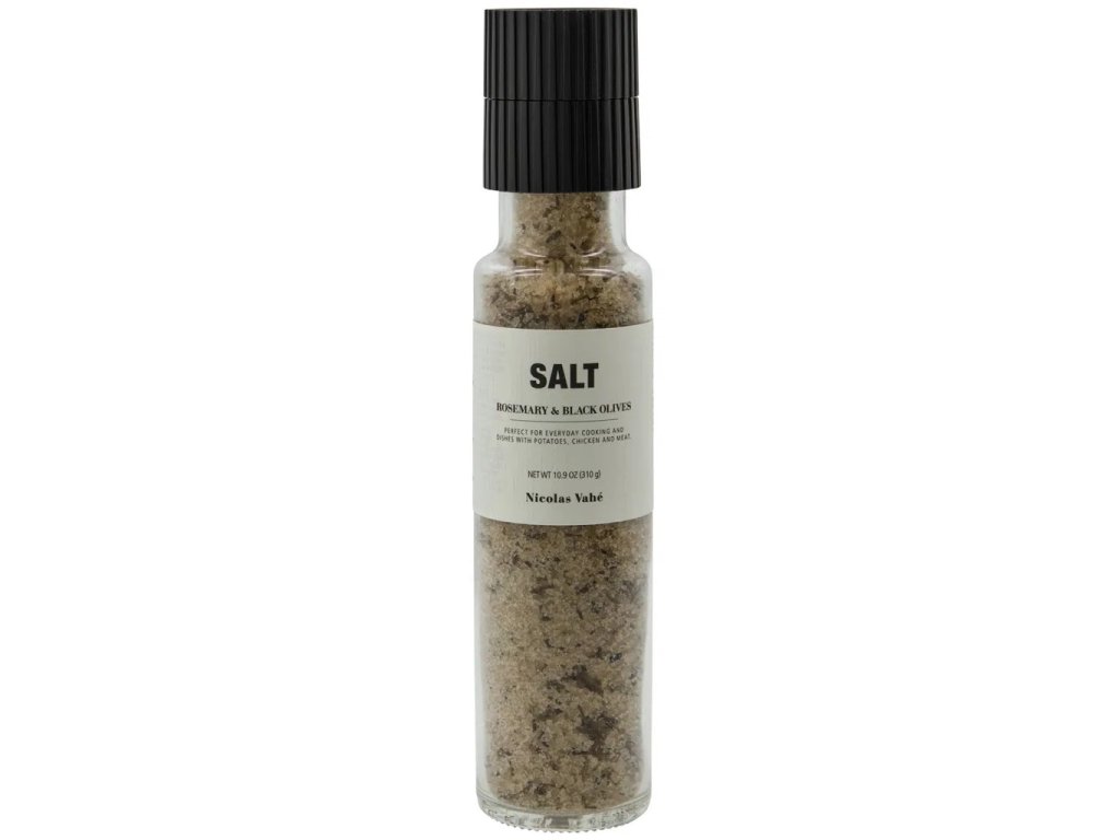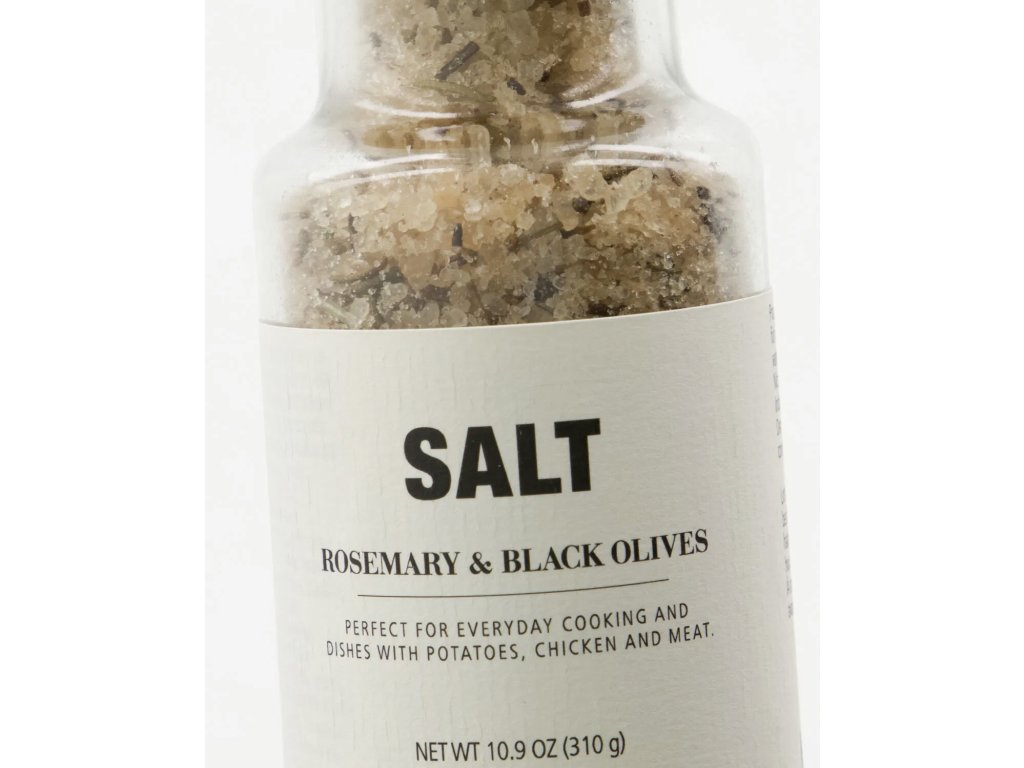 Složení: mořská sůl (protihrudkující látka E535), 2% rozmarýn, 1,3% sušené černé olivy, aroma, voda, potravinářské barvivo: E150b, může obsahovat stopy ořechů, arašídů, mléka, hořčice a siřičitanů