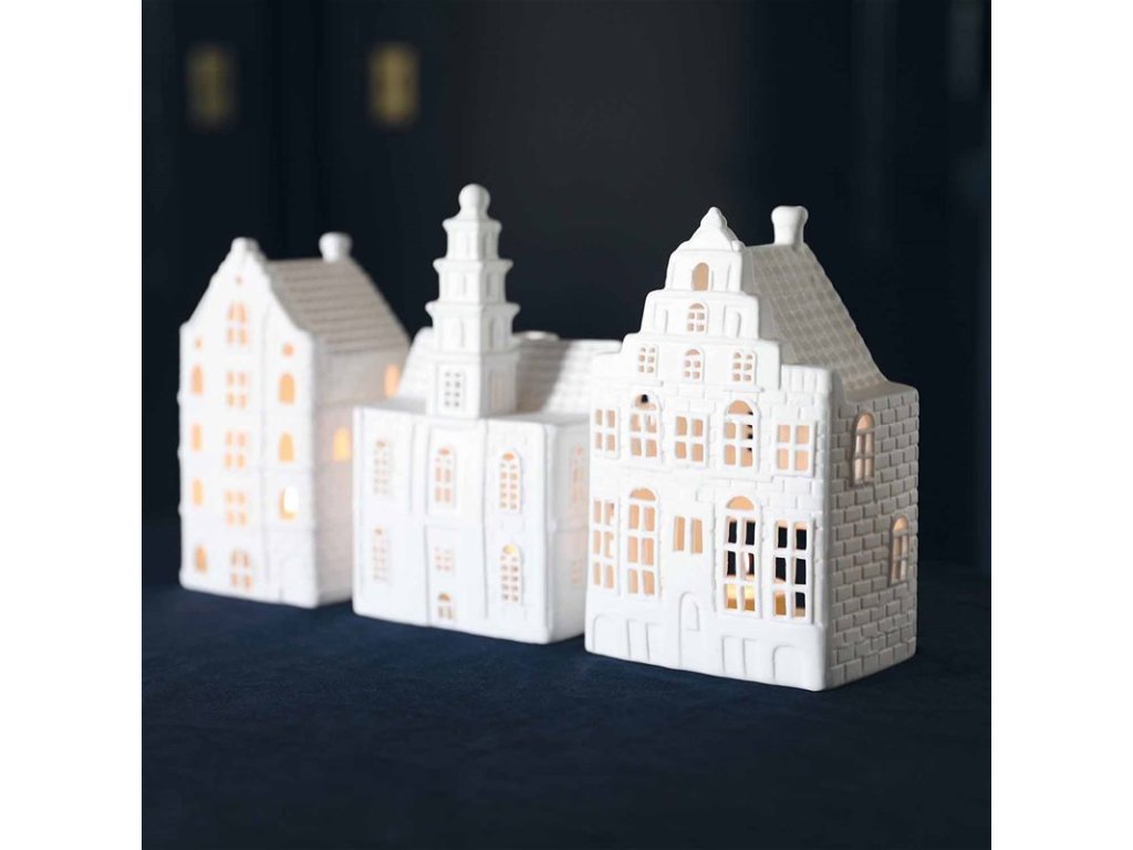 Každý domeček je inspirovaný typickou architekturou města – s úzkou fasádou, drobnými okny a charakteristickým štítem. Vyrobený z jemného matného porcelánu, vypadá jako minimalistická soška. Jakmile však dovnitř vložíte čajovou svíčku, rozzáří se teplým světlem a probudí ve vás pocit klidu, domova a tiché nostalgie. Tyto svícny nejsou jen dekorací. Jsou to malé příběhy, světelná zastavení, která dokážou zútulnit každý kout a vykouzlit atmosféru, ke které se budete každý večer rádi vracet.