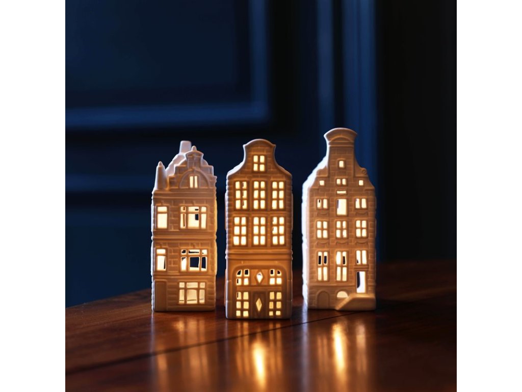 Každý domeček je inspirovaný typickou architekturou města – s úzkou fasádou, drobnými okny a charakteristickým štítem. Vyrobený z jemného matného porcelánu, vypadá jako minimalistická soška. Jakmile však dovnitř vložíte čajovou svíčku, rozzáří se teplým světlem a probudí ve vás pocit klidu, domova a tiché nostalgie. Tyto svícny nejsou jen dekorací. Jsou to malé příběhy, světelná zastavení, která dokážou zútulnit každý kout a vykouzlit atmosféru, ke které se budete každý večer rádi vracet.