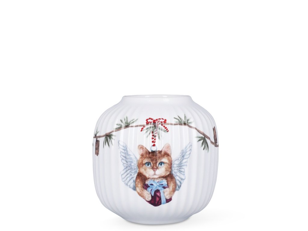 Svícen Hammershøi Christmas 2025 od dánské značky Kähler přináší do vašeho domova jemné kouzlo Vánoc a radost z tradičního severského designu. Ikonické drážkování kolekce Hammershøi, navržené designérem Hansem-Christianem Bauerem, doplňuje něžná ilustrace Rikke Jacobsen, která každý rok obohacuje tuto vánoční sérii o nový příběh. Pro rok 2025 zachytila umělkyně půvabnou ozdobu v podobě andělské kočky držící vánoční dárek, zavěšenou na modřínové větvi ozdobené mašličkou z červenobílého provázku.