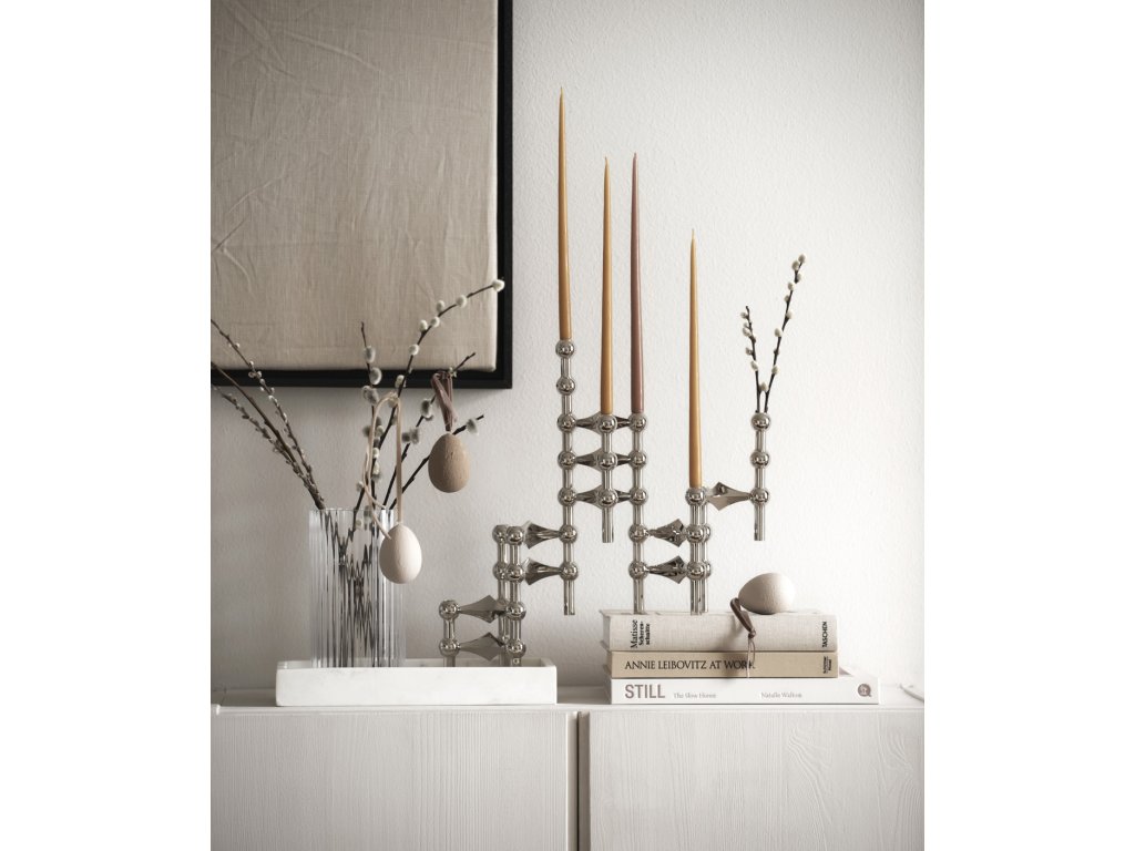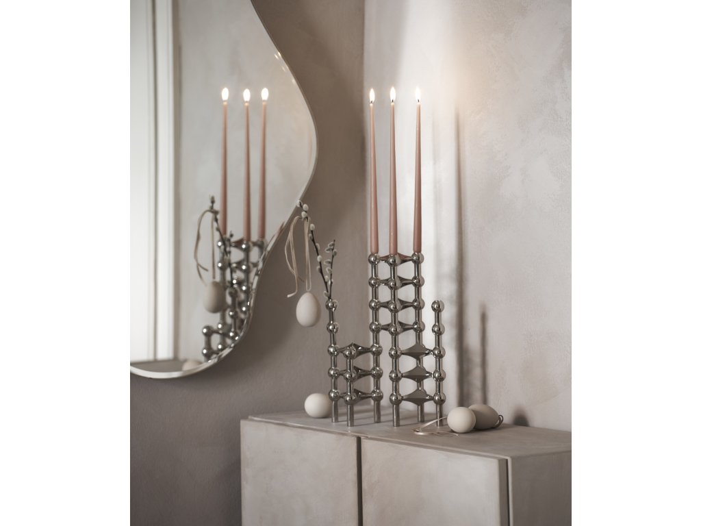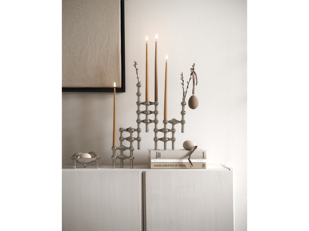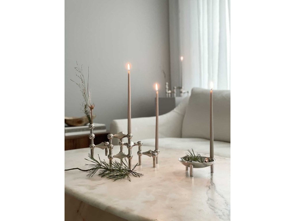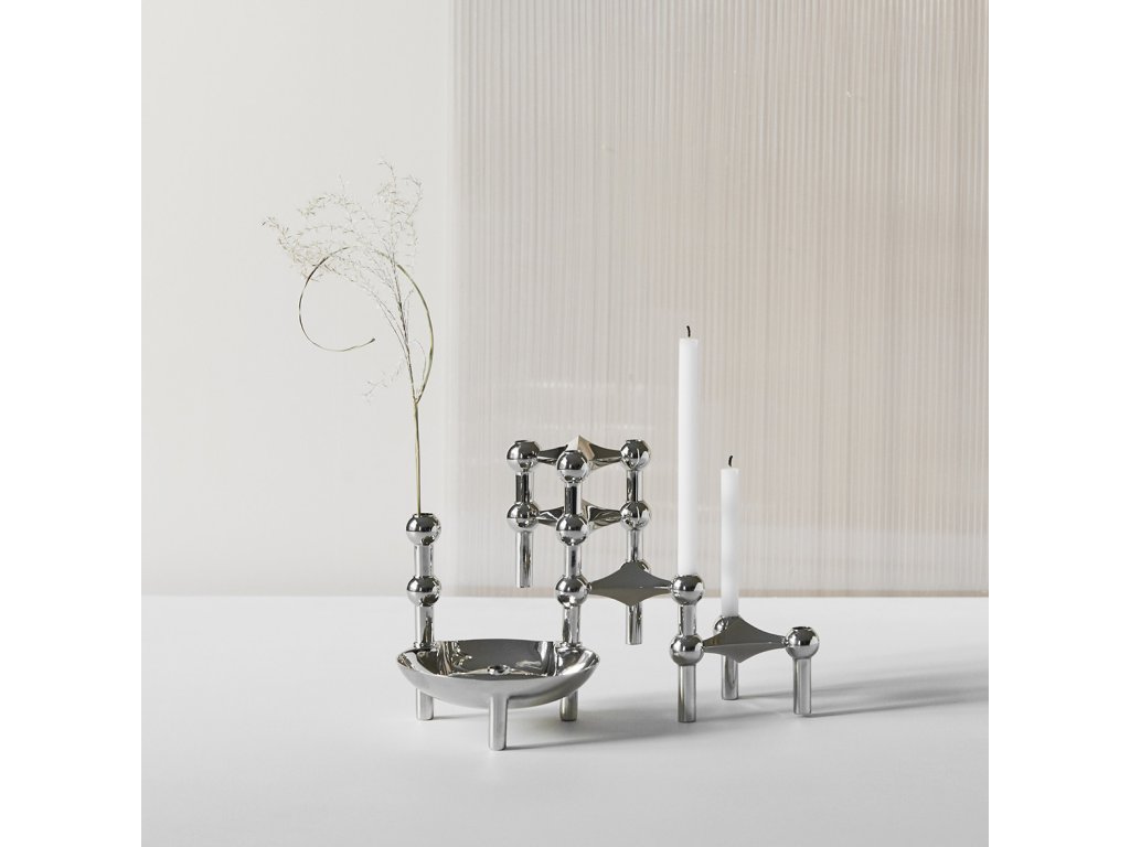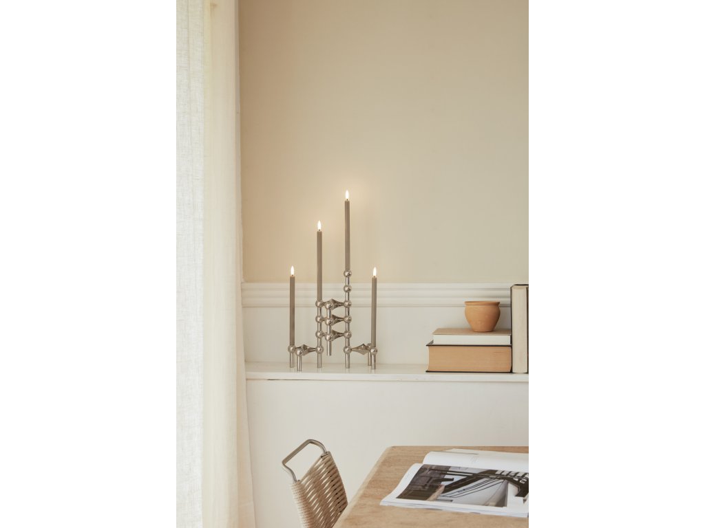 Díky modulárnímu designu nabízí svícen nekonečné možnosti. Jednotlivé části lze stohovat, kombinovat a přeskupovat, takže pokaždé vznikají nové a originální kompozice, jež odrážejí vaši vlastní fantazii. Lze jej používat s úzkými kuželovitými svíčkami o průměru 1,3 cm, zkombinovat s miskou, stojanem či vázou ze stejné kolekce, nebo jej nechat zazářit samostatně jako čistě dekorativní objekt.