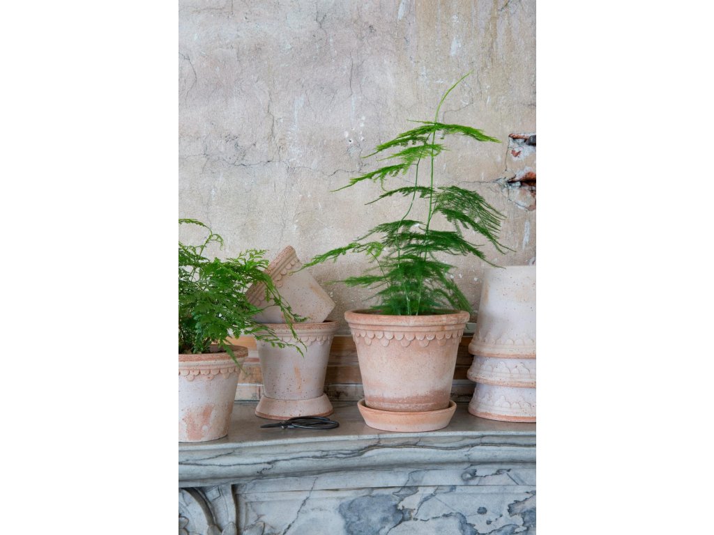 Jeho dekorativní lem se zaoblenými obloučky připomíná architekturu starých městských domů a dodává květináči nadčasový charakter. V oranžovorůžovém odstínu Raw Rosa působí klidně a sofistikovaně, skvěle zapadne do interiéru i venkovního prostředí. Každý kus je ručně vyráběn z prvotřídní italské terakoty v malých rodinných dílnách, kde se staré řemeslo předává z generace na generaci. Květináč je neglazovaný a jemně porézní – kořeny rostlin v něm mohou přirozeně dýchat, a časem získává krásnou patinu, která podtrhuje jeho jedinečný charakter. Díky drenážnímu otvoru a podmisce je vhodný i pro celoroční venkovní použití, včetně zimních měsíců.