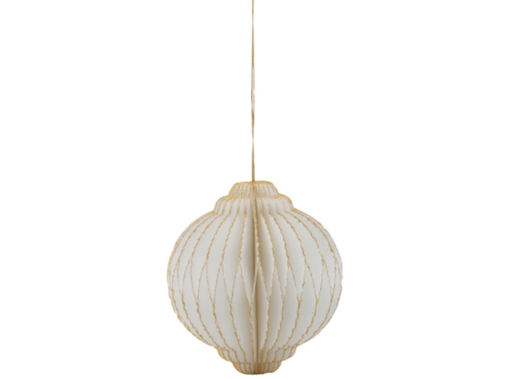 Papírová ozdoba Alsta v krémově bílé barvě přináší do vánoční výzdoby jemnost a lehkost. Její kulatý tvar složený z pevného papíru působí vzdušně, zatímco zlaté třpytky na hranách jednotlivých vrstev jí dodávají slavnostní lesk. V kombinaci s teplým světlem svíček nebo řetězů se rozzáří a vytvoří v interiéru útulnou zimní atmosféru.