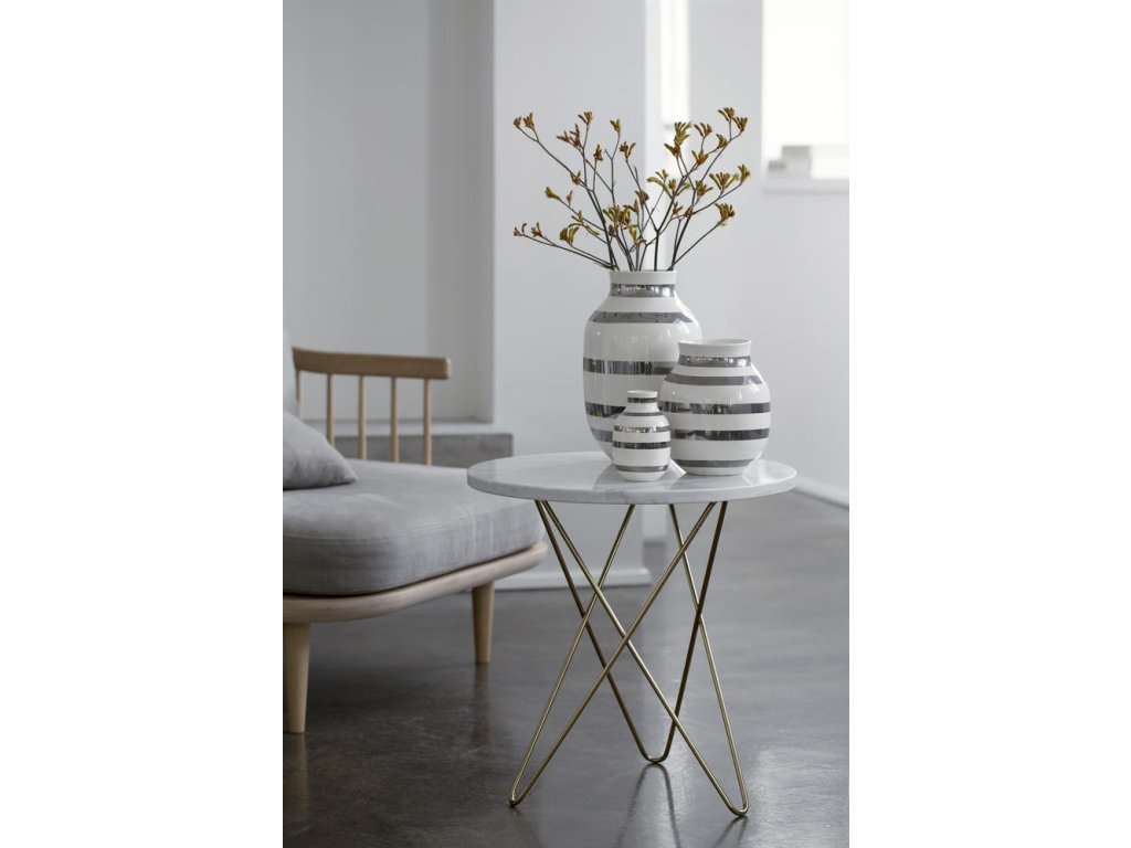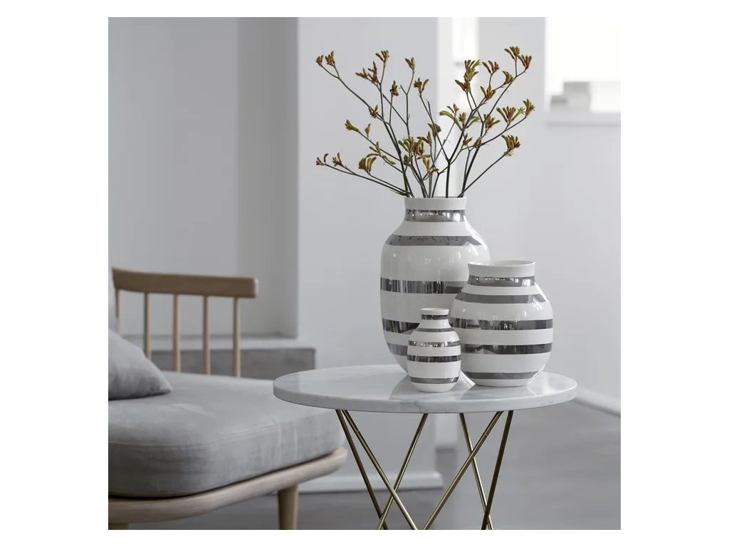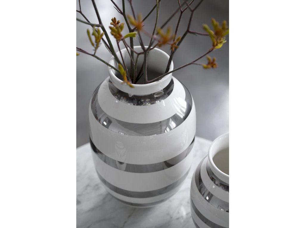 Kolekce Omaggio patří mezi designové ikony ve světě bytových doplňků. Omaggio vázy se staly velmi oblíbené pro své ručně malované pruhy různých barev na bílém keramickém podkladu. Vašemu domovu dodají tu pravou skandinávskou eleganci a spolehlivě vykouzlí sváteční atmosféru. Lesklé pruhy jsou malované stříbrnou glazurou, která může později získat tmavší patinu. Doporučujeme pouze ruční mytí. Stříbrné pruhy se nesmí leštit.