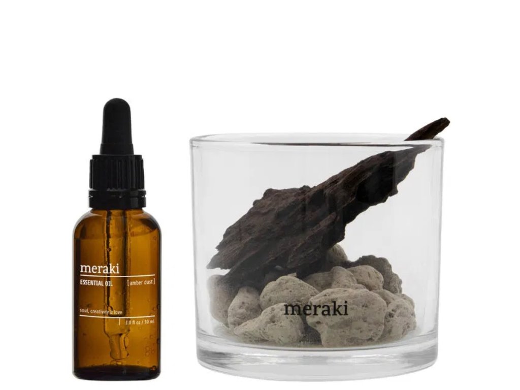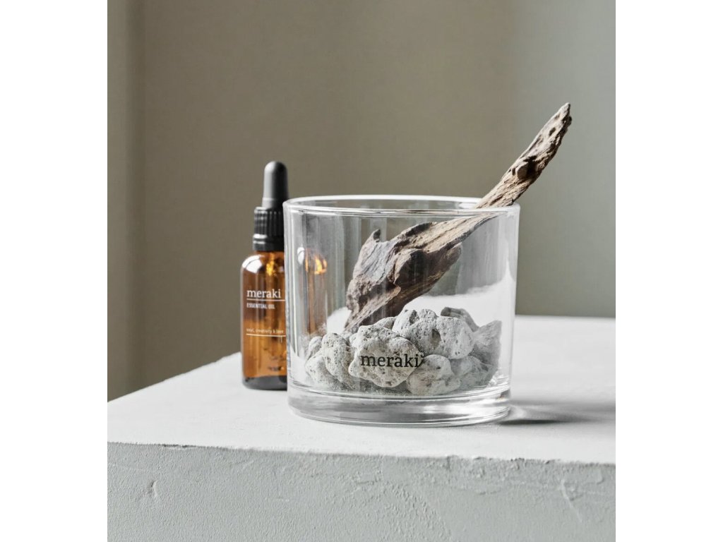 Součástí balení je také esenciální olej s vůní Amber Dust v hnědé skleněné lahvičce s praktickým kapátkem. Kombinace čirého skla, přírodních kamenů a tmavého dřeva vytváří výrazný kontrast, který krásně vynikne například na okraji vany v koupelně, kde doplní večerní atmosféru při svíčkách a horké lázni. Stejně působivě bude vypadat na konferenčním stolku v obývacím pokoji, kde podtrhne chvíle u zapáleného krbu.
