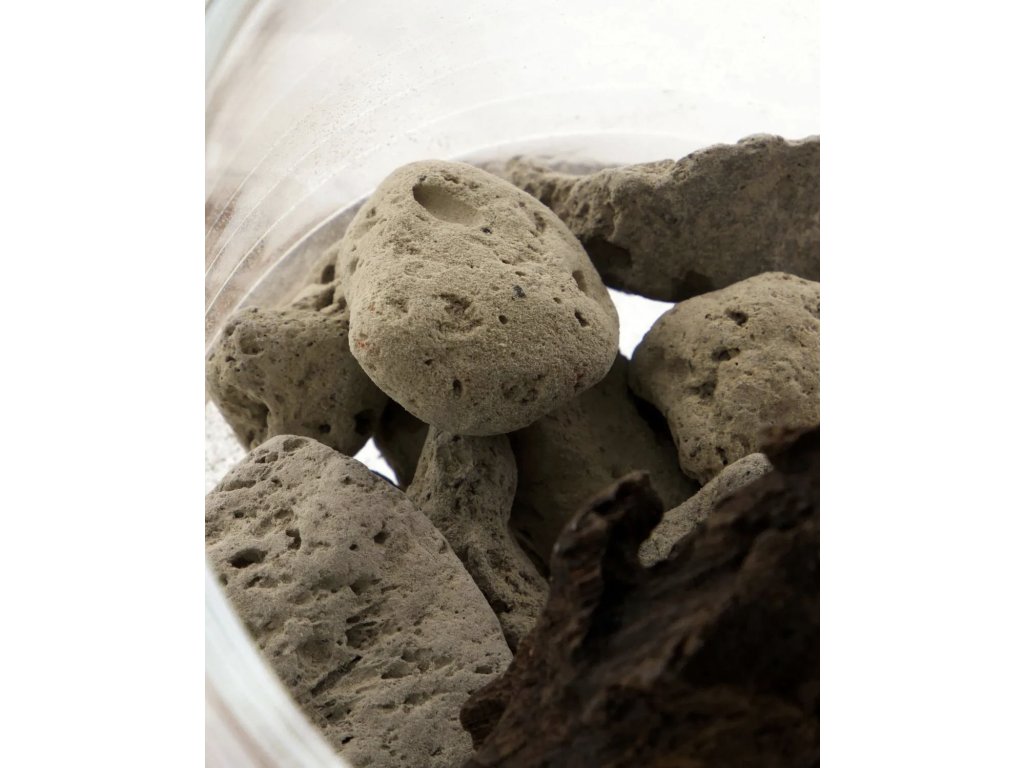 Vonný difuzér Lavastone & Wood s esenciálním olejem Amber Dust je dekorativní sadou, která se skládá ze skleněného kalíšku, který zdobí logo značky v černém provedení. Uvnitř najdete porézní lávové kameny a kousek tmavého dřeva. Jde o naplavené dřevo s nepravidelným tvarem a výraznou strukturou.