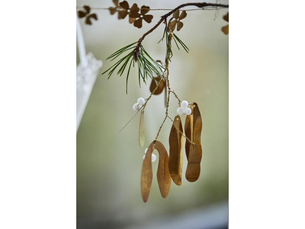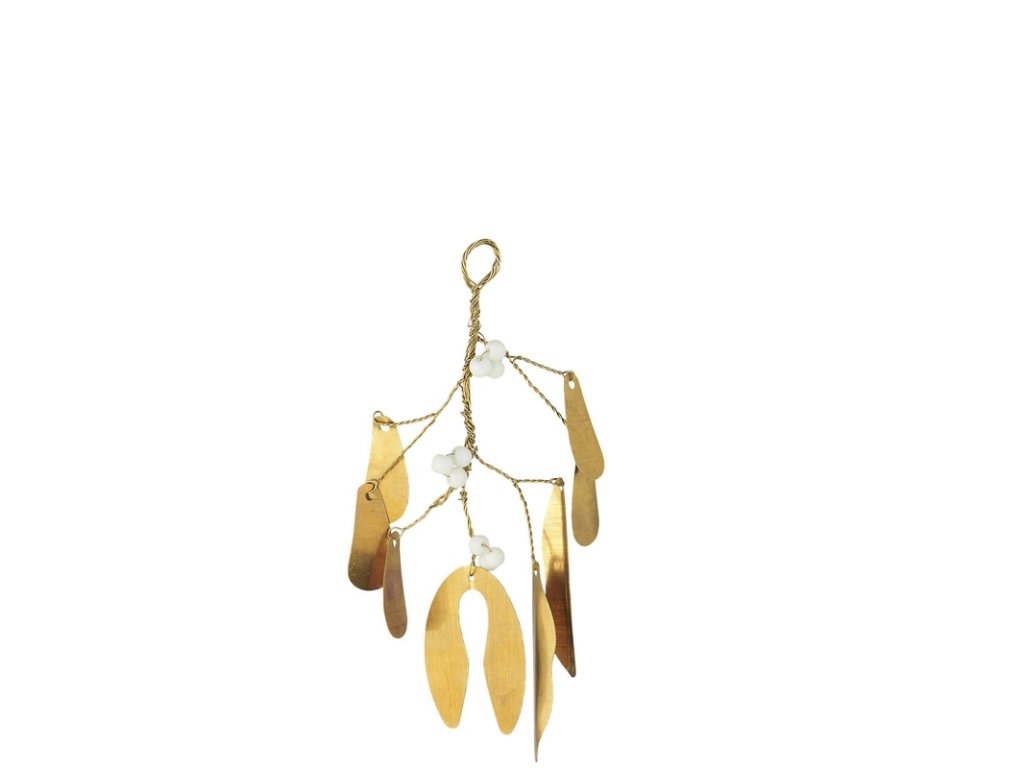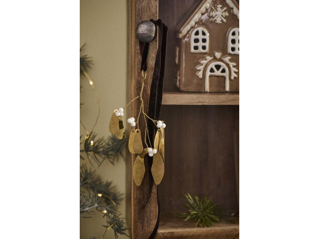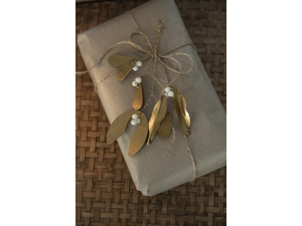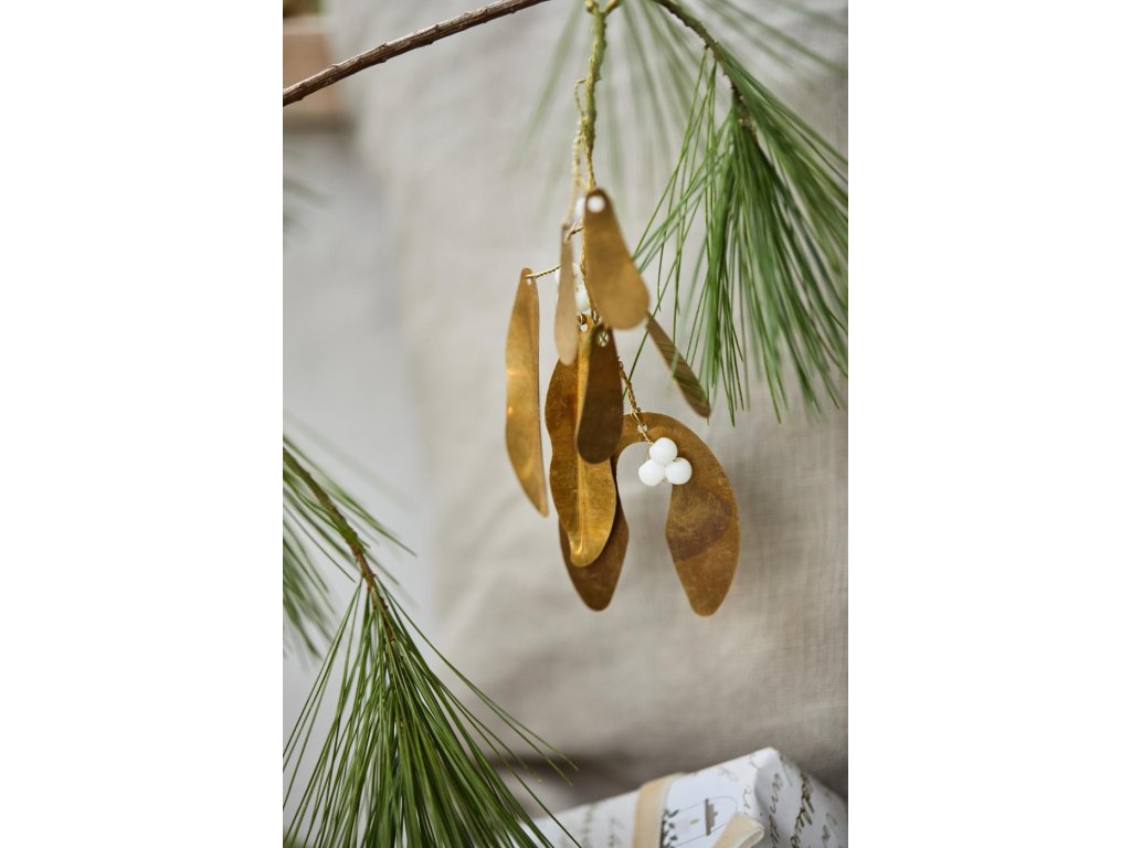 Zlatavé jmelí dánských designérů vám vydrží dlouhé roky. Vyrobené je z mosazi, což mu dodává lehký nádech vintage elegance a luxusu. Ozdobené je drobnými bílými korálky, které připomínají bobule. Protáhněte očkem saténovou stuhu a zavěste ho na stěnu, dveře, do okna, na kliku od dveří nebo jej zakomponujte jako součást dárkového balení.